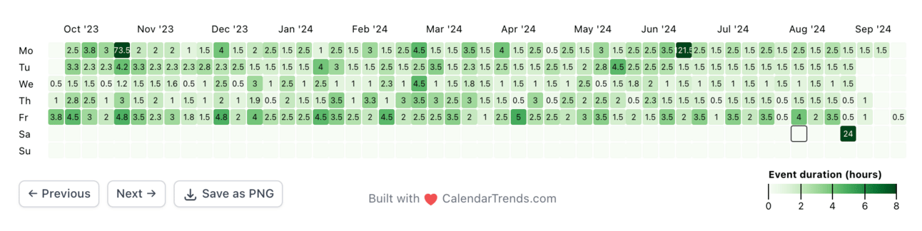 Pro Tip: Using CalendarTrends’ data-driven insights, you can analyze how effectively you’ve been spending your time and adjust accordingly to work smarter, not harder, week-to-week.